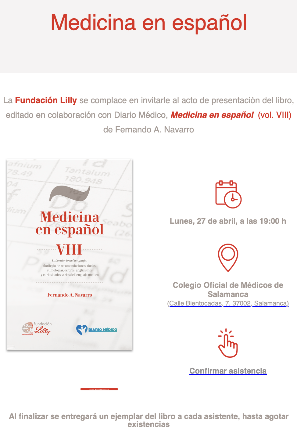 El Colegio de Médicos de Salamanca acoge el próximo 27 de abril de 2026 la presentación del libro "Medicina en español (vol. VIII)", del traductor médico salmantino Fernando A. Navarro. El acto está organizado en colaboración con la Fundación Lilly, que edita el libro junto a Diario Médico, publicación profesional de Unidad Editorial.